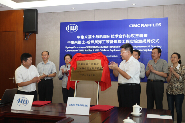 參觀后,雙方進行了深入的交流洽談,針對煙臺中集來福士的技術(shù)亟需,雙方經(jīng)篩選初步擬定了兩個第一期合作課題,確定項目組成員編寫計劃任務(wù)書,計劃組織申報省市科技攻關(guān)項目。隨后舉行了煙臺中集來福士海洋工程有限公司與哈爾濱焊接研究所共建的